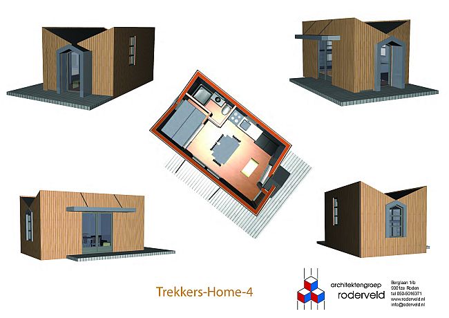 De Trekkers Home 4 is geschikt voor vier volwassen personen. Voorzien van twee tweepersoons gestapelde bedden. Een badkamer met toilet en een douche. Het keukenblok bevat een kooktoestel een koelkast en is eventueel uit te breiden met een magnetron.